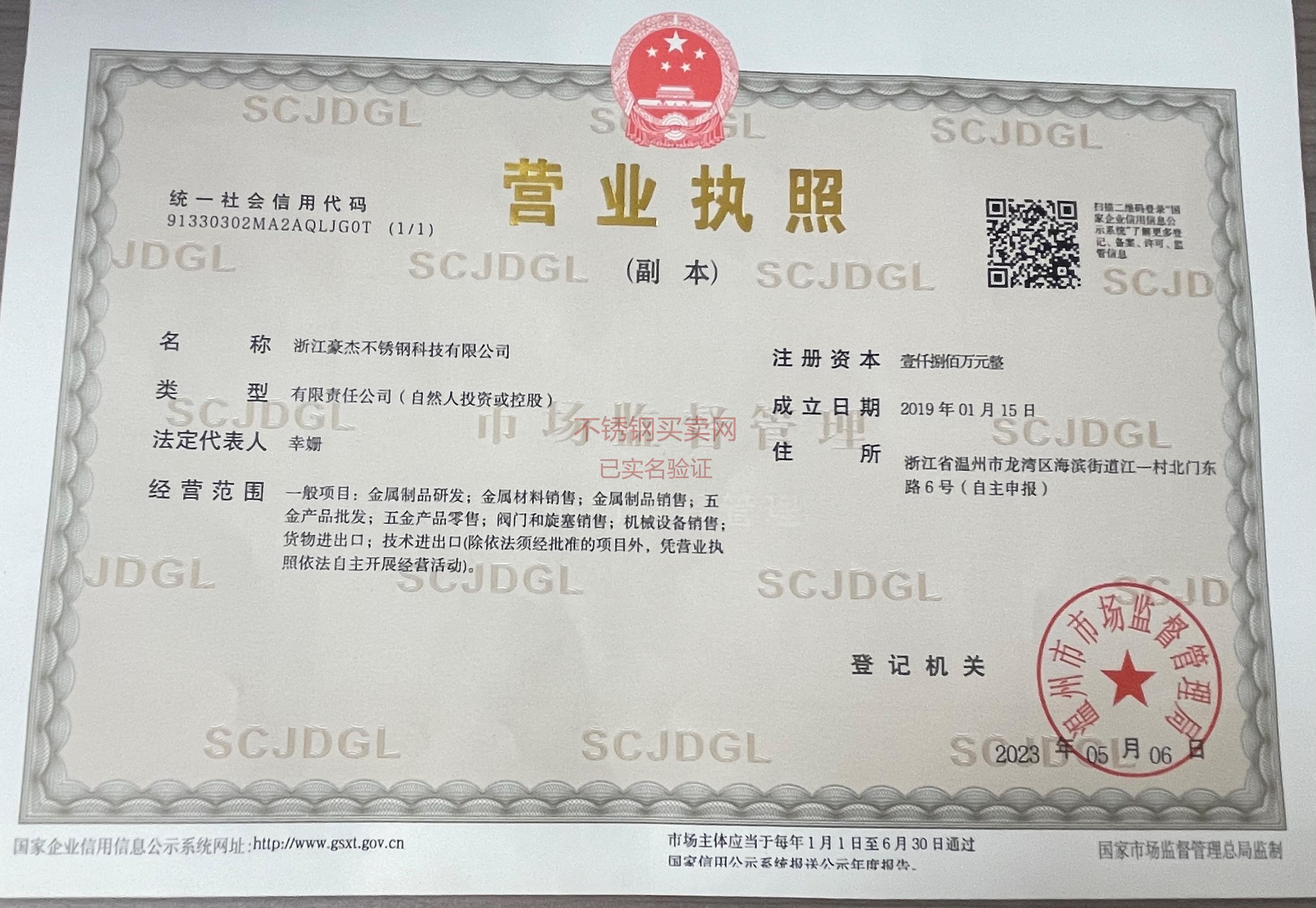 公司簡稱: 浙江豪杰不銹鋼 營業執照: