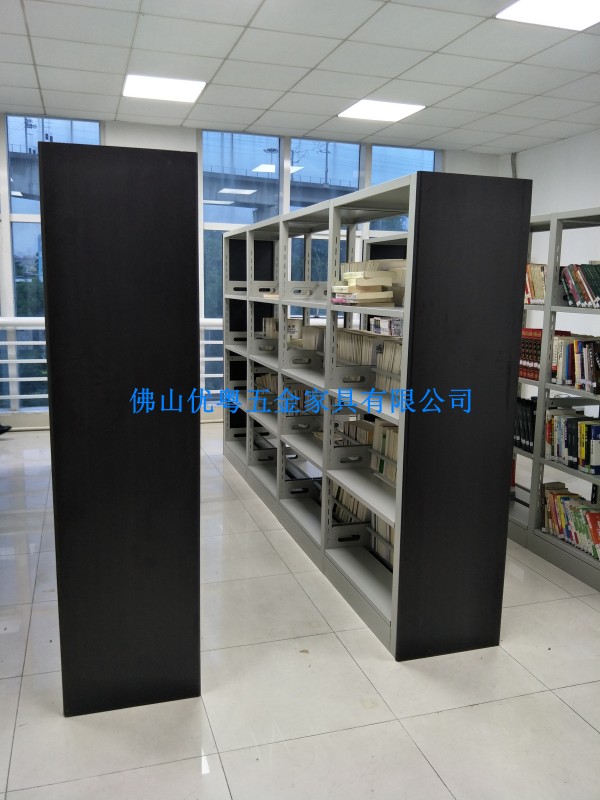1.書架為框架結構:由底坐、立柱、擱板、掛板、頂板、側護板、書擋等部分組成。